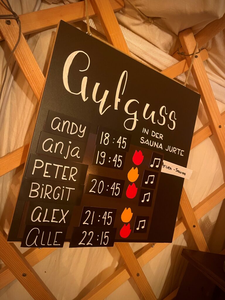 Unsere Aufgiesser arbeiten ehrenamtlich – das heisst: Die Aufgüsse finden zu festen Zeiten, statt. Dennoch kann es vorkommen, dass zu einer bestimmten Zeit kein Aufguss durchgeführt wird, wenn gerade kein Aufgiesser anwesend ist. Wenn du wissen möchtest, welche Aufgüsse aktuell geplant sind, schau einfach auf unsere Aufgusstafel. Dort findest du alle aktuell geplanten Zeiten für Themenaufgüsse und spontane Highlights.