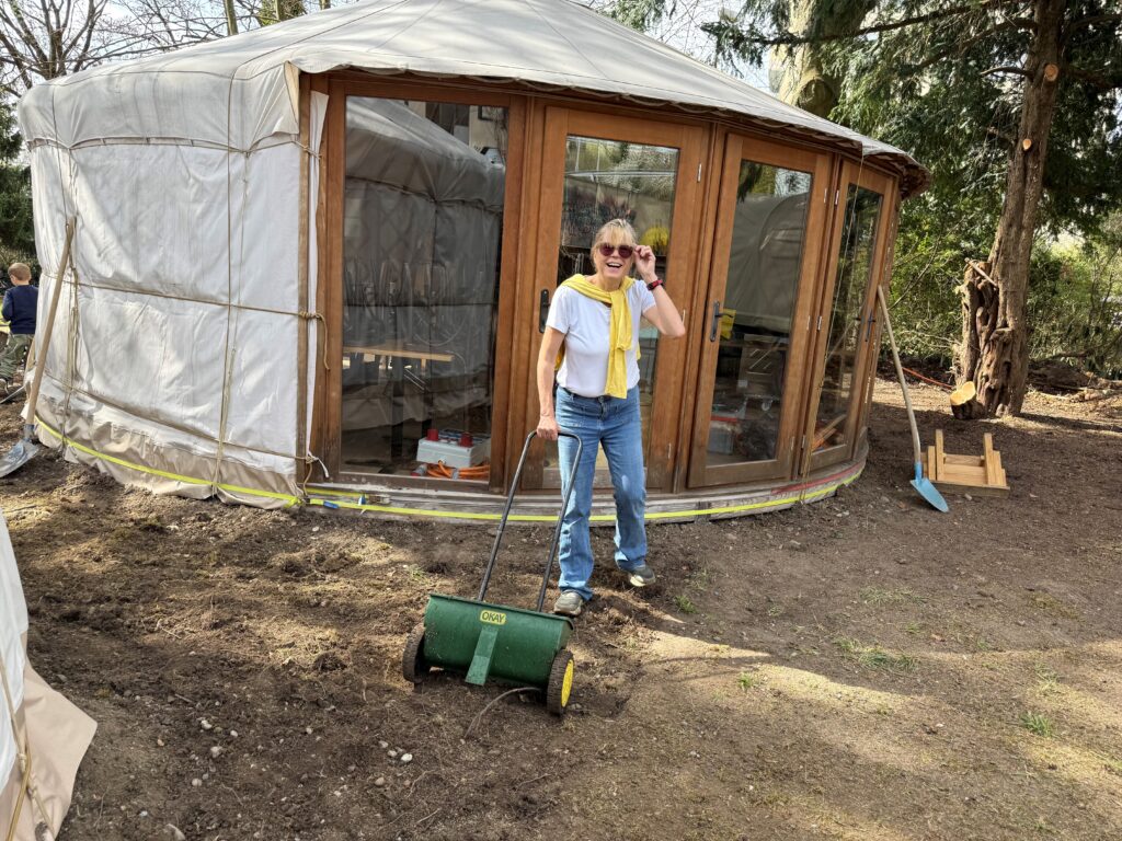 Saunagarten Unser Saunagarten bietet Platz zum Spazieren und Erholen. Bald ist hier alles wunderbar grün: Birgit am Rasen säen.